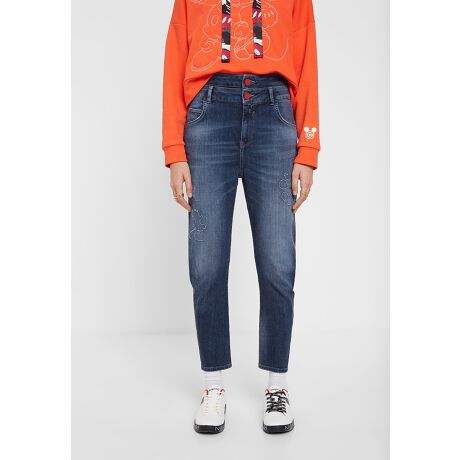 デシグアルのデニム LITLE YOUMickey Mouseのシルエットがワンポイントになったローライズのアンクル丈デニムパンツ。ダブルウエストバンド、5ポケット、ボタン&ジッパー仕様で、控えめなクラッシュ加工と装飾ウォッシュ加工を施した。自由自在にコーディネートでき、1年中着用可能。[型番:20SWDD29]