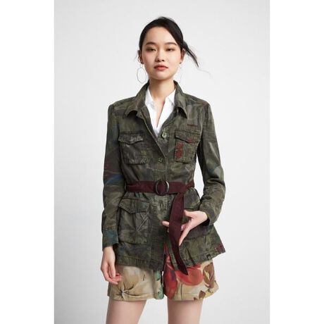 カモフラージュ柄のリヨセル製サファリジャケット。アフリカンインスピレーションの花と植物のプリントが大胆。フロントは4ポケットで、Vネック。お揃いのプリントのバックル付きベルトで、冒険に便利で快適なジャケットに。
