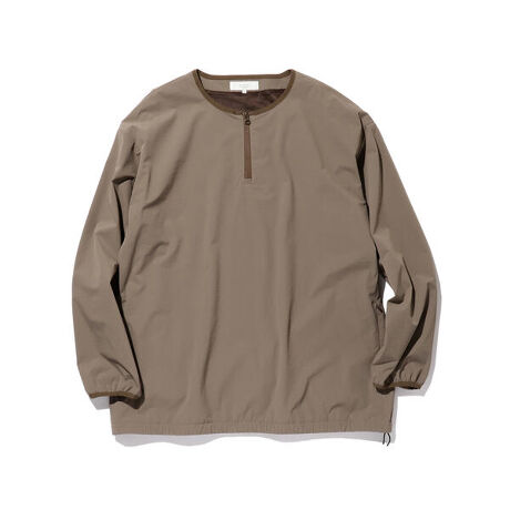 4方向への高いストレッチ性を持った素材を使用したハーフジップのノーカラープルオーバーシャツ。裏地はメッシュ仕様、サイドポケット、裾はドローコードで調節ができ、軽アウターとしても使えるデザインです。