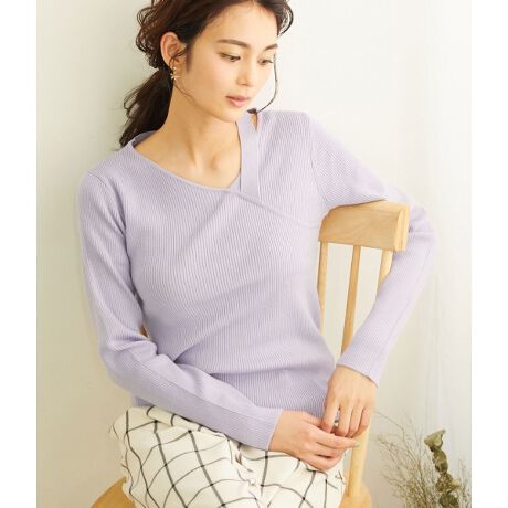 左肩に渡したストラップが目を惹く、変形デザインのカシュクールニットです。
