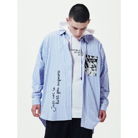 綺麗目なストライプ柄シャツに転写プリントとロゴをあしらって、感度の高いルックスを表現。