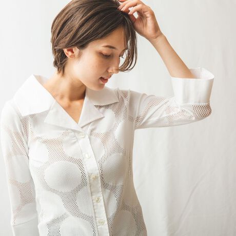 軽やかな雰囲気を漂わせる、メッシュ素材のイタリアンジャージ七分袖シャツです。大きなドット柄をあしらって、目を引くルックスに仕上げました。大きめの襟もポイントのひとつ。カフスを布帛素材に切り替え、手元はすっきり見せます。生地にストレッチがきいていて、スマートなシルエットも魅力。春夏シーズンに活躍する1着です。