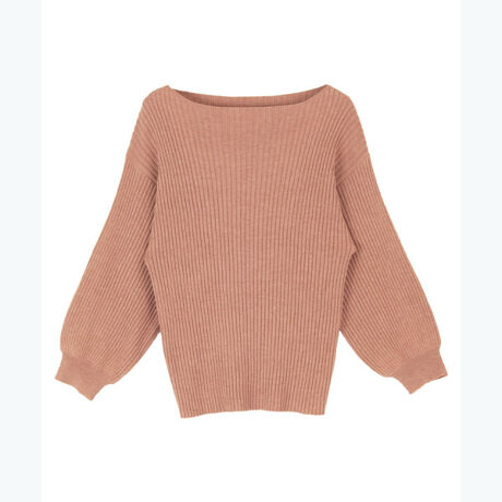 ボリュームスリーブが女性らしく、デコルテが綺麗に見えるボートネックニット。