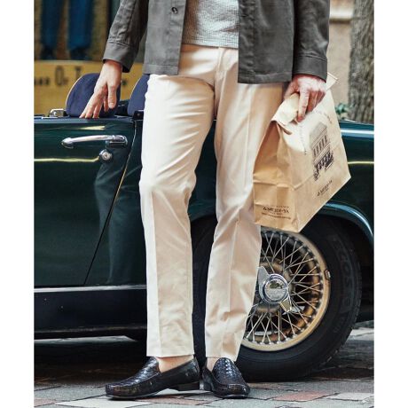 シンプルなノータックパンツです。センタープレスでキチンと見えするクリーンな印象に仕上げています。左腰のスマホポケットはファスナー付きで利便性にも優れています。