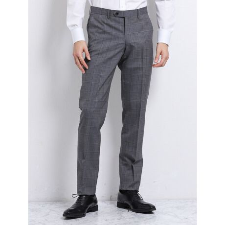 グレーを基調にしたウィンドペンチェック柄ウール混素材がオンスタイルをクラシックに彩る、スリムフィットノータックスラックス。