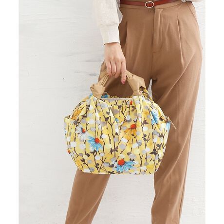 コロンとした女性らしいシルエットに印象的な柄を全面に使用した華やかなトートバッグ。
