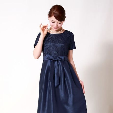 落ち着いた濃紺の中にレース素材とシャンタン生地が大人の魅力を引き立てます。