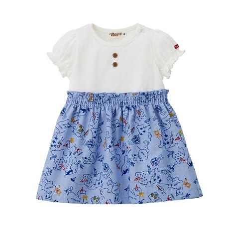 ミキハウス ホットビスケッツのワンピース上身頃は、透け感のある涼しげな素材で、真夏にも着やすいワンピース。袖は女の子らしいパフスリーブになっています。●ホックボタンの肩開き仕様:〜90cm[型番:72-1904-829]