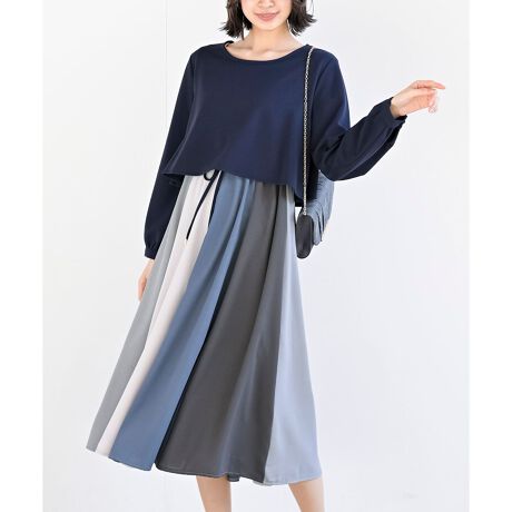 無地ブラウスとスカートのコーデが1枚で楽しめるドッキングワンピース。
