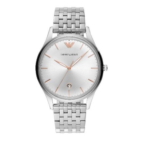 光を反射するホワイトのサンレイダイアルに、シンプルでシャープな印象を与えるバーインデックスを合わせ、エンポリオアルマーニらしいエレガントな気品溢れる仕上がりとなっています。