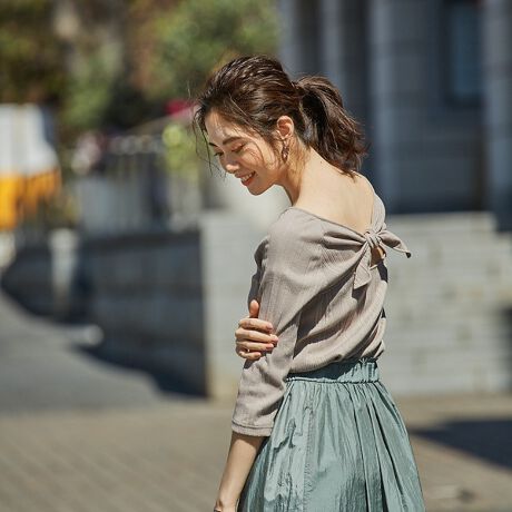 リボンは結び加減を調節して頂けるので、そのままでクルーネックにも、ゆるく結んでオフショルにも着られる2WAY仕様です。