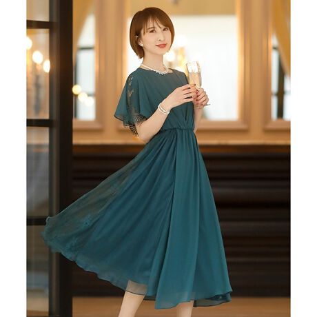 袖はレースとシフォンの二枚重ねになっており、ひらりと揺れるシフォンが上品な印象に。