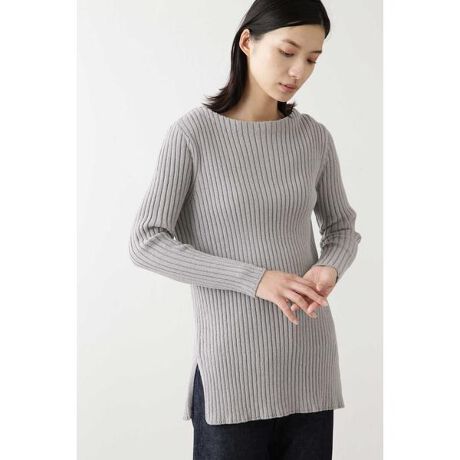 綿ナイロンの壁糸(強い撚りをかけた太い糸と、無撚りの細い糸を引き揃えて太い糸にかけた撚りと逆の撚りをかけた糸)を使用。太い糸が細い糸に液状に絡みつくので、編むと独持の凹凸が出ます。シャリ感とボリュームのあるワイドリブを長め丈のプルオーバーに仕立てました。スカートにもパンツにも合わせやすいデザインです。フロントアウトして着て、長め丈×長め丈のバランスがお勧めです。