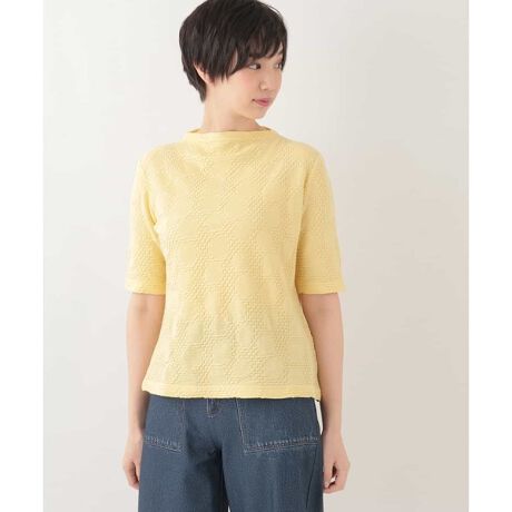 絞り加工によって立体的な柄を表現したデザインカットソー。コットンベースの手触りの良い素材でのお作りなので風通しがよく、長く楽しんでいただける一枚に仕上げました。お袖は五分丈なので気になる二の腕もしっかりとカバーしてくれるのが嬉しいポイント。オフネックとコンパクトなお作りがモード感を演出してくれます。
