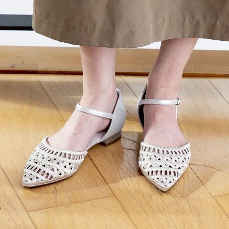 フラットヒールでありながら、ツンとした女性らしいシルエット。旬の透け感アイテムや、ラフなスタイリングの足元にもぴったりです。