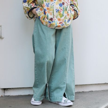 スーパーハッカのコットンストレッチツイルユーズド加工前スリットワイドパンツ