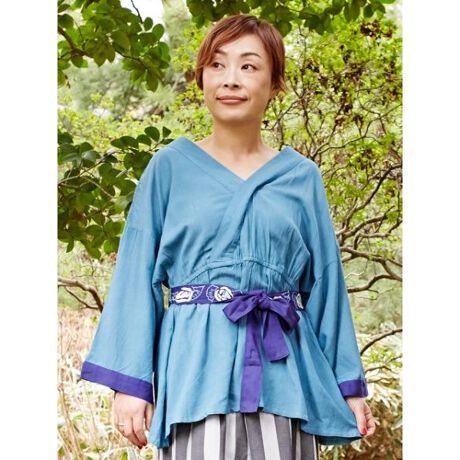 着物の合わせにならった、人気の「ならいシリーズ」に無地が登場しました。腰までのチュニック丈で着やすく、シンプルおしゃれが楽しめる一枚。牡丹の刺繍の入ったウエスト帯がアクセント。自分の持っているベルトと合わせても可愛いです。