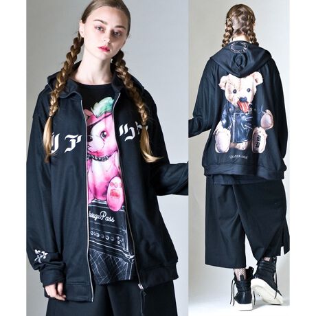 ロックなくまちゃんプリントが魅力のストリート感溢れるビッグシルエット ジップアップ パーカー。