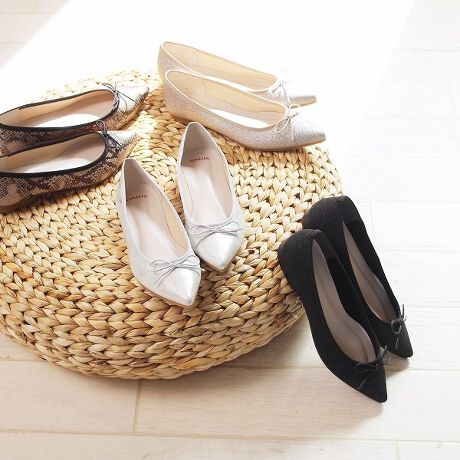 定番のリボン付きポインテッドトゥバレエシューズ。