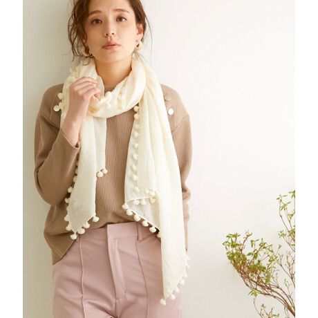 四方をポンポンタッセルで縁取った、可愛らしいルックスのストールです。