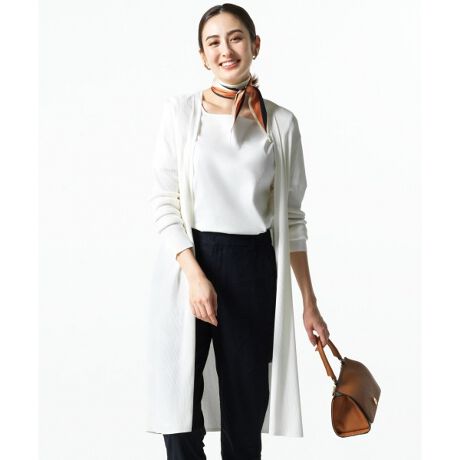 カジュアルにもオフィススタイルにも重宝するリブベースのロングカーディガンです。ハイゲージで品よく編み立てたすっきりとした縦ラインのシルエットで衿元もシンプルに仕上げているので、中身を選ばずいろいろな着合わせが楽しめる万能アイテムです。今年はレングスを伸ばし大人っぽく着合わせられるデザインにしました。