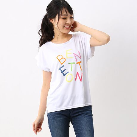 ベネトン(水着)のハンソデ TシャツUPF50+。フレンチスリーブの袖口が折り返したようなデザインになっているので、二の腕を細く見せる効果が期待できます。イタリア本国デザインのカラフルなロゴがポイント!