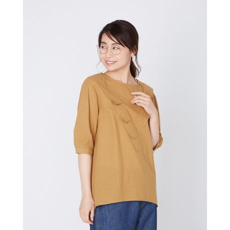 前身頃のタックフリル使いがおしゃれなニュアンス感が特徴のブラウスです。ほどよくゆったりとしたシルエットなので、かわいらしさと綿麻素材の涼やかな着心地がおすすめです。