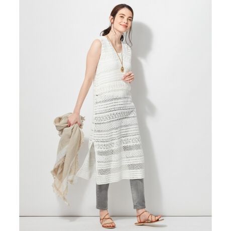 クロシェ編みのロング丈ニットワンピースです。スカートと同じ柄で編み立てたVネックデザインになっています。裾に大きくスリットを入れ、ボトムとのレイヤードがすっきりと見えるように仕上げました。ストンと着るだけで存在感があり、型崩れもしにくく上品な印象を保ってくれます。リネン素材のワイドパンツやデニム合わせはもちろん、ティアードドレスとのレイヤードスタイルもおすすめです。