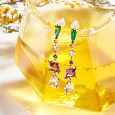 揺れるたびに透明感のあるカラーガラスが煌めき、耳もとを華やかな印象に。