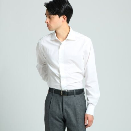 立ち上がりと水平に近い衿型がポイントワイドスプレッドカラーデザイン。顔まわりが品良く見えるシャツです。