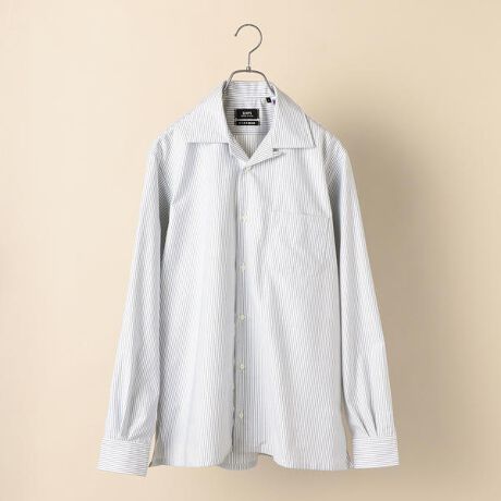 こちらはオープンカラー型のシャツ。衿の開き具合を調整し細かな部分にも丁寧な拘りが垣間見えるアイテムです。また、今の雰囲気にもマッチするボックスカット、身幅に余裕を持たせたシルエットに仕上げております。シャツですので1枚着やジャケットなどのインナーとしても通年お使いいただけます。