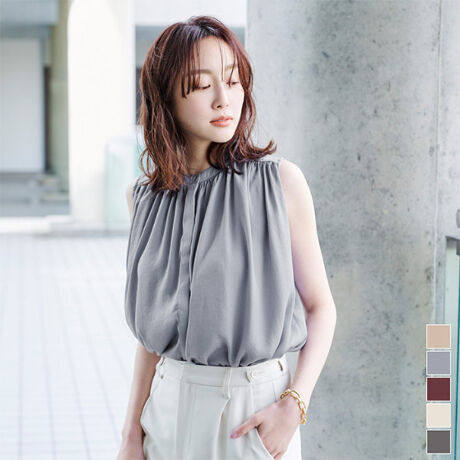 ・柔らかく落ち感のあるサテン生地が上品な印象のギャザーノースリーブブラウス。