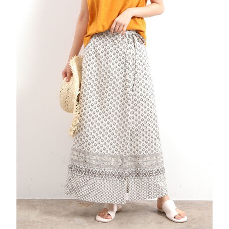 アジアンテイストの着こなしを楽しめる、パネルプリントのラップスカート。