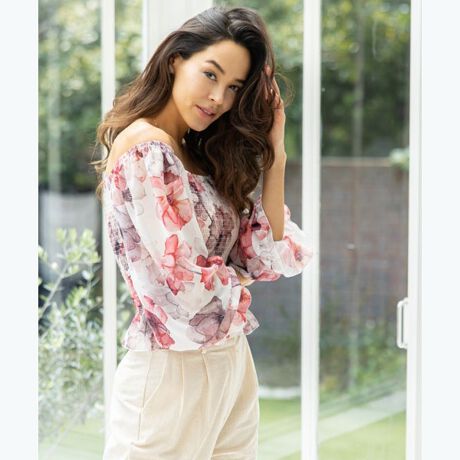 立体的なフォルムとフラワープリントで華やぐ、主役級トップスです。