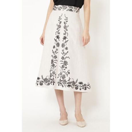 繊細なフラワー刺繍をあしらったサーキュラースカート。センター刺□で縦のラインを強調してくれるので、すっきりした見え感です。