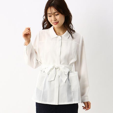 シャツ、ブラウス、羽織、はおり、ロールアップ、前開き、カジュアル、大人カジュアル、きれいめ、キレイ、コーデ、コーディネート、仕事、通勤、服装、リボン、夏、晩夏、初秋、小さいサイズ、大きいサイズ