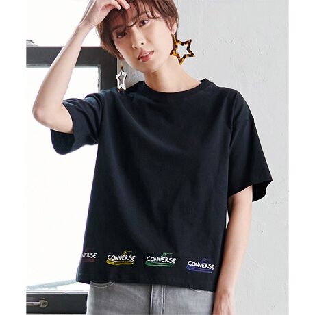 裾にカラフルなコンバーススニーカーのプリントが並んだTシャツ。