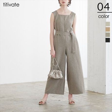 リネンライクな素材でこれからの季節にぴったりなベルト付きスクエアネックオールインワン。
