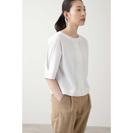 ハケメのベースに細いドビーのストライプを入れたオリジナル配色の素材です。薄くて軽い夏にぴったりの素材感になります。袖口のタックで作った袖ボリュームがデザインポイントのブラウスです。前あきですが、巾広めの前立てをヒヨクにすることでプルオーバーとしてワイドパンツやスカートとサラッとコーディネイトしていただけます。デイリーユースに着まわして頂けます。