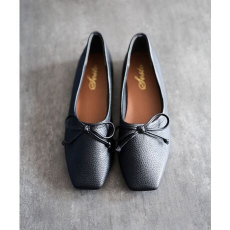 スクエアトゥでスタイリッシュでクールな印象を持たせつつも、靴と同素材のさりげないリボンが女性らしさを忘れないポイントに。スカートやパンツ、どんなスタイルにも合わせやすい調整役になってくれます。