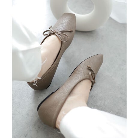 ほんのりレトロな雰囲気の丸みを帯びないエッジの効いたスクエアトゥで今年らしい新鮮さを添えたバブーシュ見えするバレエシューズ。端正な甲のボリューム感がどこかモードな足元を演出します。