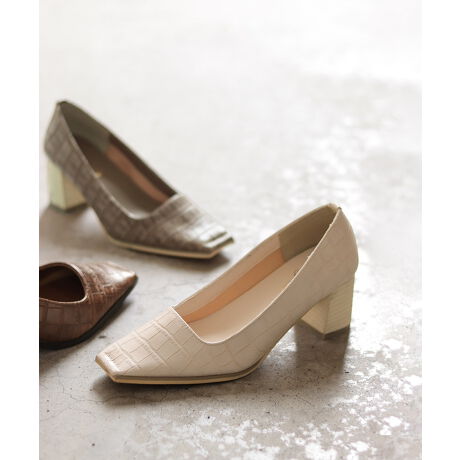 ウッドヒールのスクエアトゥチャンキーヒールパンプス