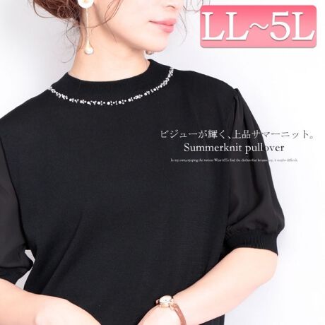 【LL-5L】 ビジュー使いシフォン袖サマーニットトップス 大きいサイズ