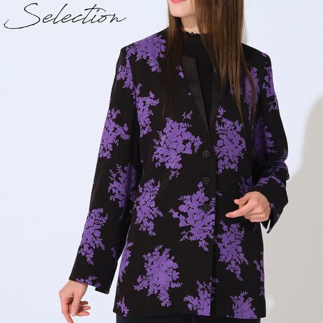 深い色合いが上品なフラワープリントをのせたジャケット。サテンの重ね襟デザインが、お洒落な雰囲気。