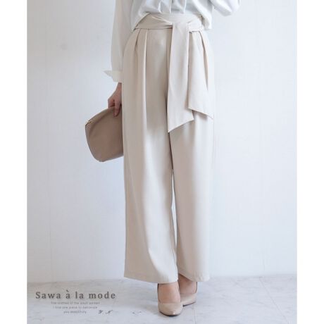 サワアラモードのハイウエストのリボンベルトワイドパンツ レディース ベージュ ロング丈 春 夏 秋 冬
