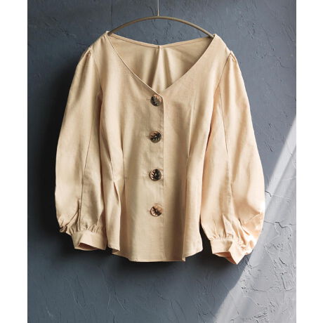 メタルプレート釦が新鮮なウエストシェイプブラウス。