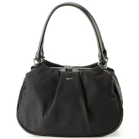 ふんわりとしたタックでフェミニンなテイストに仕上げており、レザーのハンドルの付け根の三角形のカンもポイントです。