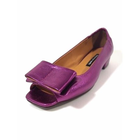 ワークス(WORKS)のボロネーゼ製法パンプス。箔加工を施した柔らかなラム(羊革)を使用。箔ならではの発色の良い大胆な色使いと大きなリボンが特徴。