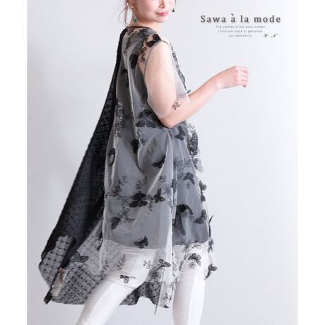 サワアラモードの葉っぱと蝶の刺繍が重なるシアーワンピース レディース ファッション