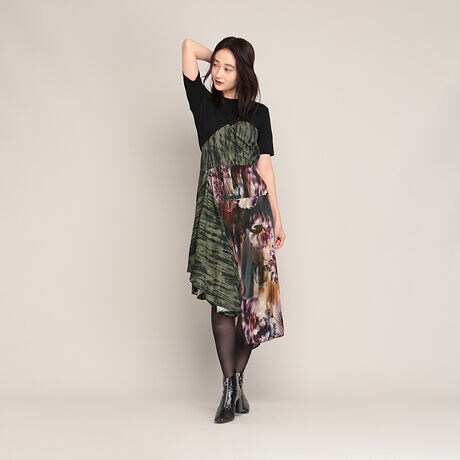 みずみずしく幻想的なフラワー柄と趣のあるタイダイ柄とのマッチングが新鮮なワンピースです。生地をランダムに切り替えて、女性らしく傾きがちなワンピースにラフさをプラス。胸元はやわらかなカットソー地、スカート部分はドライタッチな風合いと素材の変化も楽しめます。イレギュラーヘムを取り入れることで、動きのひとつひとつをエレガントに見せてくれます。